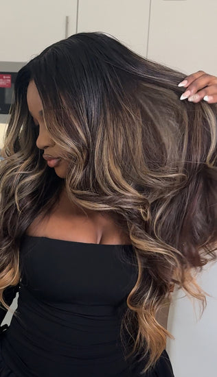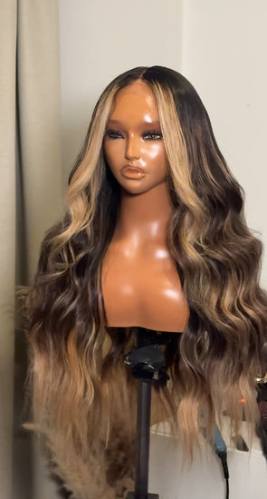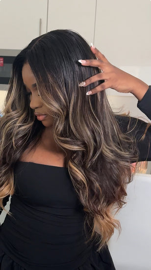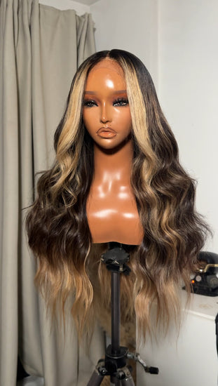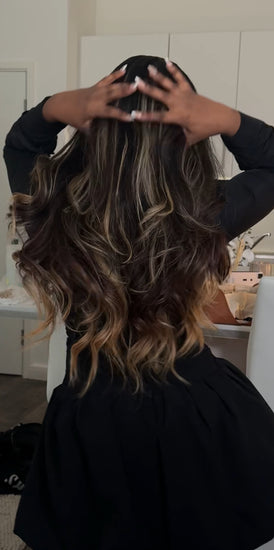 This Unit is made using our Premium Raw Extensions. Custom coloured to a gorgeous dark chocolatey deep brown with caramel strings of ribbon like highlights running through the hair to give a beautiful contrast against the brown. We kept the depth at the top and mids of the hair whilst keeping the ends bright so to allow versatility on where to wear the unit. A blond that you can wear for any occasion.